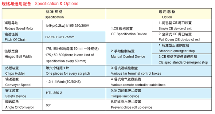 ●鏈板排屑機(jī)按鏈條節(jié)距區(qū)別有31.75,50.8,63.5,101.6幾種供選擇