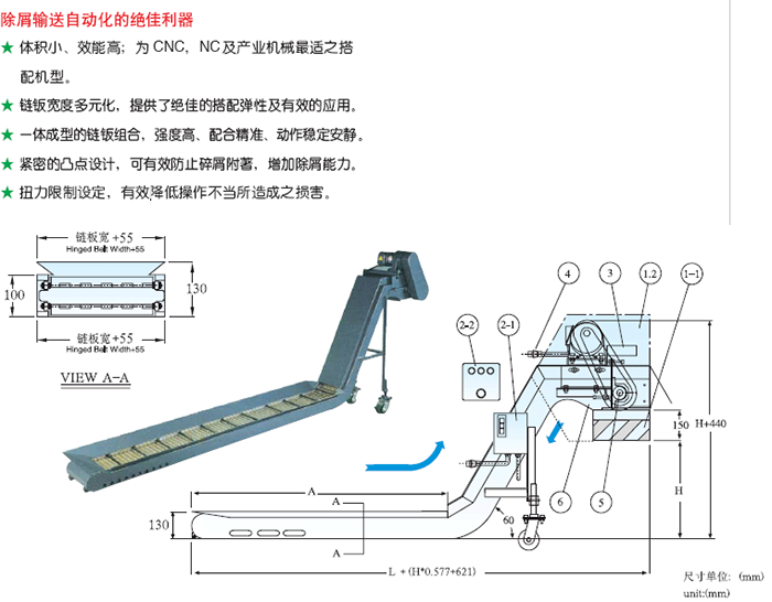 ●鏈板排屑機(jī)是多用途的物料輸送裝置,其帶提升形式特別適用于含有冷卻液切屑的輸送