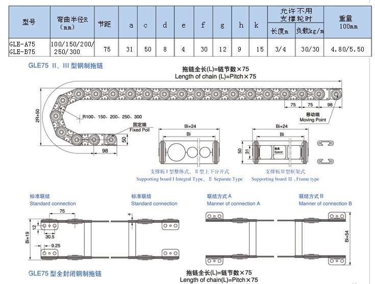TLG75III鋼制拖鏈,內(nèi)高30mm節(jié)距75mm,彎曲半徑可分100/150/200/250/300,最小寬度50mm。