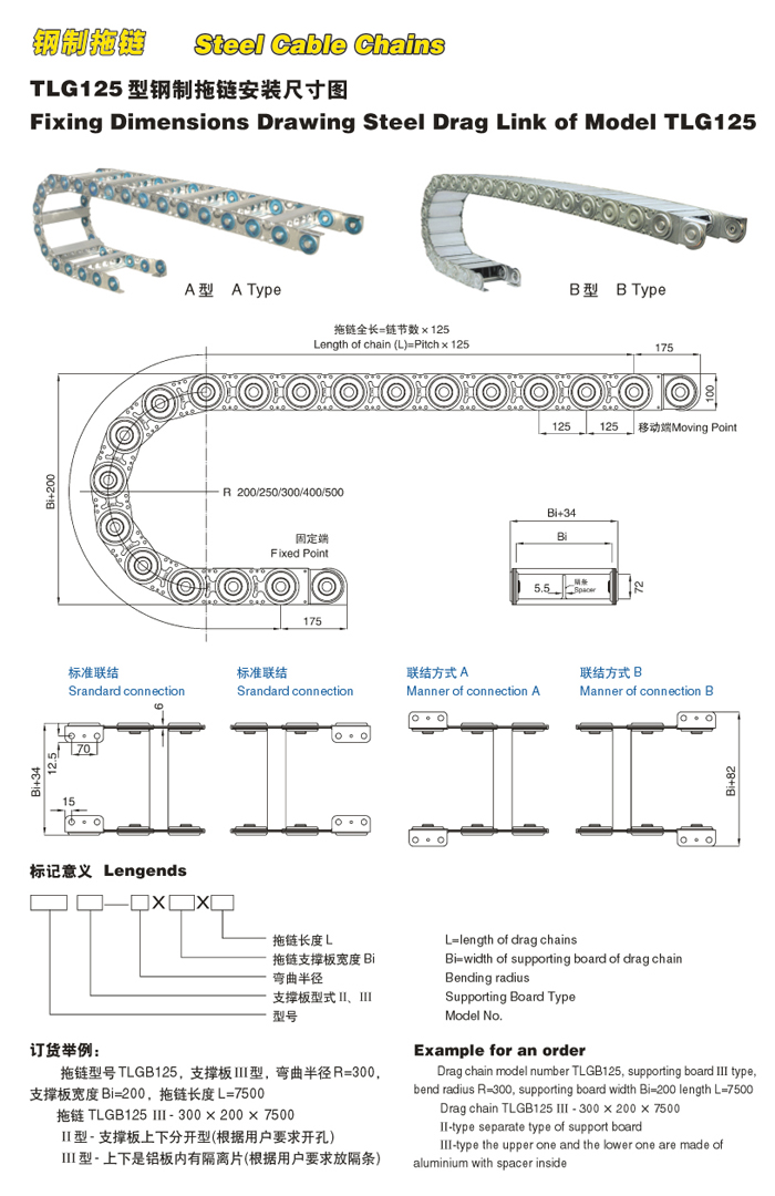 TLG125F型全封閉鋼制拖鏈:簡(jiǎn)介:節(jié)距125mm,彎曲半徑有200,250,300,350,470,500,575,.鏈板高度100mm,拖鏈內(nèi)高66mm.