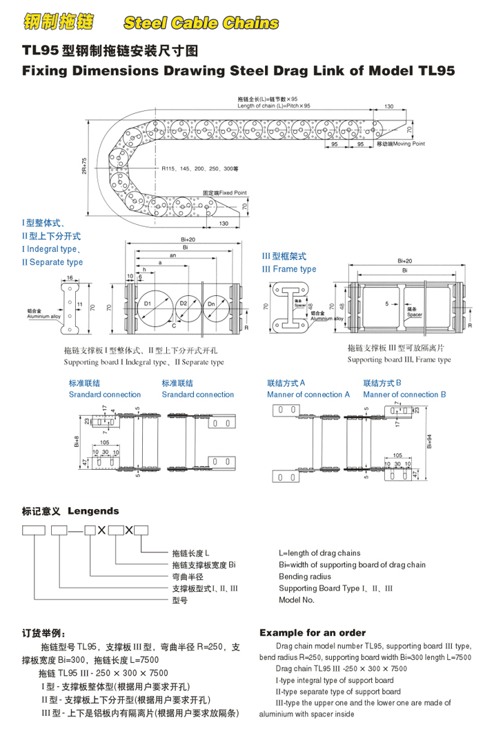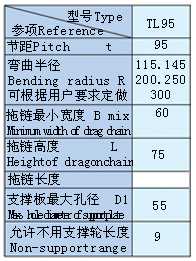 TL95III型鋼制拖鏈:簡介:節(jié)距95mm,彎曲半徑有115,125,145,200,250,300.鏈板高度70mm,拖鏈最小寬度60mm.內高45mm