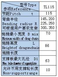 TL115II型鋼制拖鏈:簡(jiǎn)介:節(jié)距115mm,彎曲半徑有145,200,225,250,300.鏈板高度86mm,拖鏈最大孔徑63mm