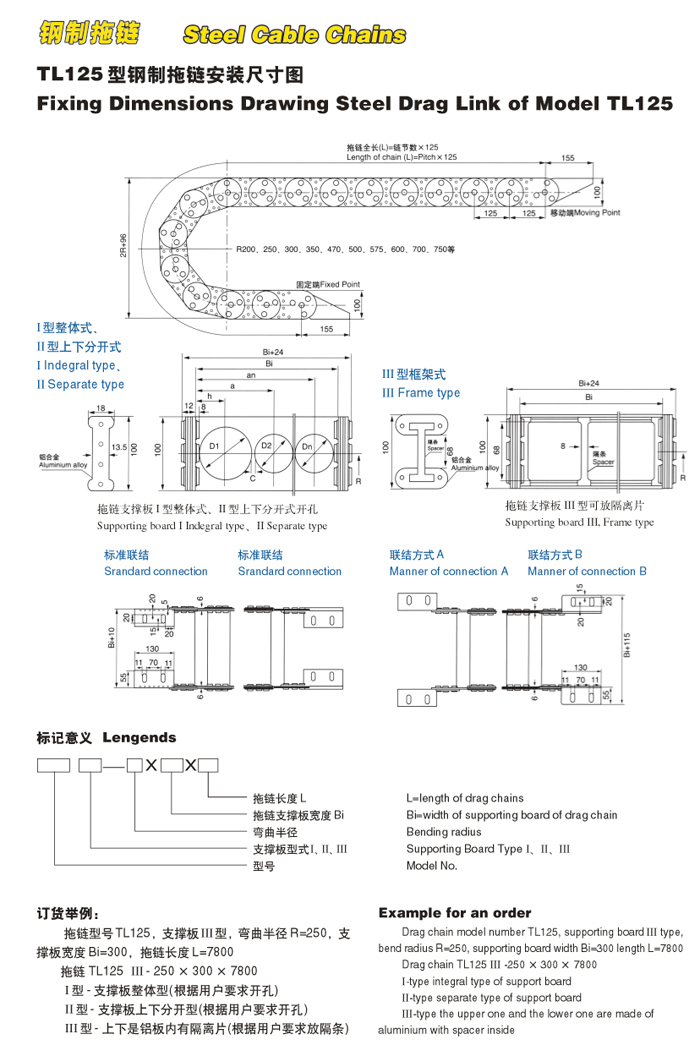 拖鏈型號TL125,支撐板Ⅲ型,彎曲半徑R=250,支撐板寬度Bi=300,拖鏈長度L=7800